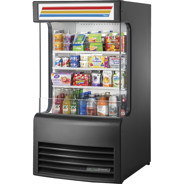 True’s air curtain merchandisers are designed with enduring quality that protects your long term investment. Designed using the highest quality materials and components to provide the user with colder product temperatures and lower utility costs in an attractive merchandiser that brilliantly displays food and beverages. Large, open front allows easy access to display levels and places maximum attention on merchandising. Energy efficient, factory balanced, refrigeration system holds 35°F to 40°F (1.6°C to 4.4°C). Patented reversing condenser fan motors. Fan motors reverse during defrost off cycles to help keep condenser coil free from dirt, dust and debris. Keeping coils clean optimizes the unit’s performance providing colder holding temperatures and increased energy efficiency. Regularly scheduled thorough cleaning of coils still recommended. Durable and permanent non-peel or chip black vinyl exterior with white aluminum interior and stainless steel floor and deck pans. Adjustable, heavy duty PVC coated shelves. Entire cabinet structure is foamed-in-place using a high density, polyurethane insulation that has zero ozone depletion potential (ODP) and zero global warming potential (GWP).