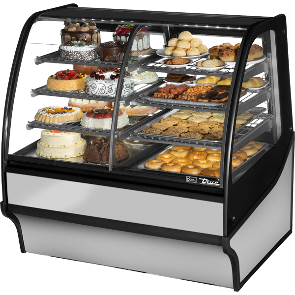 - True’s combination "refrigerated" and "dry" display case combines efficient, high volume merchandising and exceptional refrigeration with an elegant curved glass front for sophisticated presentation of high end deli, desserts and pastries.