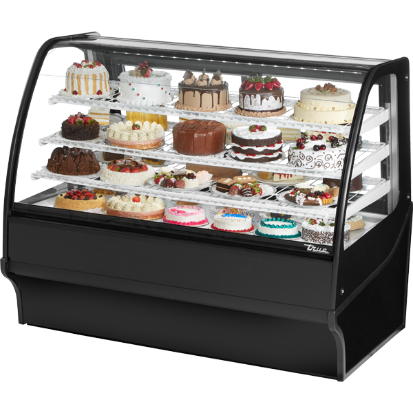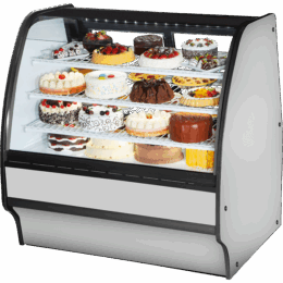 True’s refrigerated display merchandisers combine efficient, high volume merchandising and exceptional refrigeration with an elegant curved glass front for sophisticated presentation of high end desserts and pastries. Factory engineered, self-contained, capillary tube system using environmentally friendly R290 hydro carbon refrigerant that has zero (0) ozone depletion potential (ODP), & three (3) global warming potential (GWP). High capacity, factory balanced refrigeration system. Standard temperature range maintains cabinet temperatures of 33°F to 41°F (.5°C to 5°C), ideally suited for refrigerated bakery and cold deli products. Cabinet is NSF/ANSI Standard 7 compliant to hold open food product. Two (2) rear sliding glass doors for back access. Exterior – powder coated FDA black rounded front and back, black aluminum aesthetic side and front panels. Color options available (upcharge may apply) – white or stainless. Curved glass front and side glass panels. Interior – powder coated FDA white over CRS material. Color options available (upcharge may apply) – black or stainless. Three (3) tiered levels of adjustable wire cantilever shelves that match cabinet interior color. Chrome plated wire shelves standard on stainless units. Front glass swings Up for easy cleaning access.