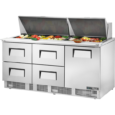 True’s food prep units are designed with enduring quality that protects your long term investment. Factory engineered, self-contained, capillary tube system using environmentally friendly R290 hydro carbon refrigerant that has zero (0) ozone depletion potential (ODP), & three (3) global warming potential (GWP). All stainless steel front, top and ends. Corrosion resistant GalFan coated steel back. Door fitted with 12" (305 mm) long recessed handle that is foamed-in-place with a sheet metal interlock to ensure permanent attachment. Stainless steel, patented, foam insulated lid and hood keep pan temperatures colder, lock in freshness and minimize condensation. Removable for easy cleaning. Interior – attractive, clear coated aluminum liner. Stainless steel floor with coved corners. 8" (204 mm) deep, 1/2" (13 mm) thick, full length removable cutting board included. Sanitary, high density white polyethylene provides tough preparation surface. Each drawer accommodates one (1) full size 12"L x 20”W x 6"D (305 mm x 508 mm x 153 mm) food pan & three (3) 1/9 size or six (6) 1/6 size & three (3) 1/9 size pans per drawer (sold separately). Drawer will support varying size pan configurations with available pan divider bars (drawer pans sold separately). Heavy-duty stainless steel drawer slides and rollers. Foamed-in-place using a high density, polyurethane insulation that has zero ozone depletion potential (ODP) and zero global warming potential (GWP).