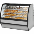 True’s refrigerated glass merchandisers combine efficient, high volume merchandising and exceptional refrigeration with an elegant curved glass front for sophisticated presentation of high end desserts and pastries. Cabinet is NSF/ANSI Standard 2 compliant to hold open food product. Two (2) rear sliding glass doors for back access. Exterior – powder coated FDA black rounded front and back, solid wood sides with aluminum cover and front panels. Color options available (upcharge may apply) – white or stainless. Interior – powder coated FDA white over CRS material. Color options available (upcharge may apply) – black or stainless. Three (3) tiered levels of adjustable wire cantilever shelves that match cabinet interior color. Chrome plated wire shelves standard on stainless units. Curved glass front is single pane tempered glass with extra large viewing area to maximize product presentation.