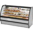 True’s “dry” glass merchandisers combines efficient, high volume merchandising with an elegant curved glass front for sophisticated presentation of high end desserts and pastries. Cabinet is NSF/ANSI Standard 2 compliant to hold open food product. Two (2) rear sliding glass doors for back access. Exterior – powder coated FDA black rounded front and back, solid wood sides with aluminum cover and front panels. Color options available (upcharge may apply) – white or stainless. Interior – powder coated FDA white over CRS material. Color options available (upcharge may apply) – black or stainless. Three (3) tiered levels of adjustable wire cantilever shelves that match cabinet interior color. Chrome plated wire shelves standard on stainless units. Curved glass front is single pane tempered glass with extra large viewing area to maximize product presentation.