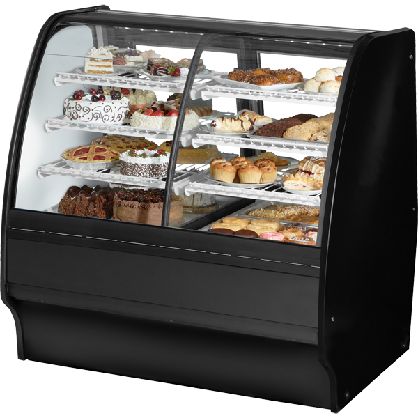 True’s refrigerated glass merchandisers combine efficient, high volume merchandising and exceptional refrigeration with an elegant curved glass front for sophisticated presentation of high end desserts and pastries. Factory engineered, self-contained, capillary tube system using environmentally friendly R290 hydro carbon refrigerant that has zero (0) ozone depletion potential (ODP), & three (3) global warming potential (GWP). High capacity, factory balanced refrigeration system. Standard temperature range maintains cabinet temperatures of 33°F to 41°F (.5°C to 5°C), ideally suited for refrigerated bakery and cold deli products. Cabinet is NSF/ANSI Standard 7 compliant to hold open food product. Two (2) rear sliding glass doors for back access. Exterior – powder coated FDA black rounded front and back, solid wood sides with aluminum cover and front panels. Color options available (upcharge may apply) – white or stainless. Interior – powder coated FDA white over CRS material. Color options available (upcharge may apply) – black or stainless. Three (3) tiered levels of adjustable wire cantilever shelves that match cabinet interior color. Chrome plated wire shelves standard on stainless units. Curved glass front is single pane tempered glass with extra large viewing area to maximize product presentation.