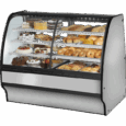 - True’s refrigerated display case glass merchandiser combines efficient, high volume merchandising and exceptional refrigeration with an elegant curved glass front for sophisticated presentation of high end deli, desserts and pastries.