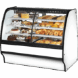 True’s refrigerated glass merchandisers combine efficient, high volume merchandising and exceptional refrigeration with an elegant curved glass front for sophisticated presentation of high end desserts and pastries. Factory engineered, self-contained, capillary tube system using environmentally friendly R290 hydro carbon refrigerant that has zero (0) ozone depletion potential (ODP), & three (3) global warming potential (GWP). High capacity, factory balanced refrigeration system. Standard temperature range maintains cabinet temperatures of 33°F to 41°F (.5°C to 5°C), ideally suited for refrigerated bakery and cold deli products. Cabinet is NSF/ANSI Standard 7 compliant to hold open food product. Two (2) rear sliding glass doors for back access. Exterior – powder coated FDA black rounded front and back, solid wood sides with aluminum cover and front panels. Color options available (upcharge may apply) – white or stainless. Interior – powder coated FDA white over CRS material. Color options available (upcharge may apply) – black or stainless. Three (3) tiered levels of adjustable wire cantilever shelves that match cabinet interior color. Chrome plated wire shelves standard on stainless units. Curved glass front is single pane tempered glass with extra large viewing area to maximize product presentation.
