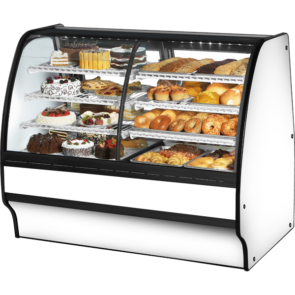 - True’s refrigerated display case glass merchandiser combines efficient, high volume merchandising and exceptional refrigeration with an elegant curved glass front for sophisticated presentation of high end deli, desserts and pastries.