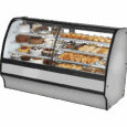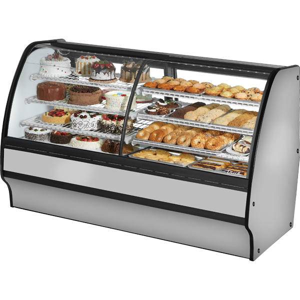 - True’s refrigerated display case glass merchandiser combines efficient, high volume merchandising and exceptional refrigeration with an elegant curved glass front for sophisticated presentation of high end deli, desserts and pastries.