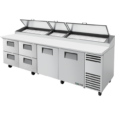 True’s pizza prep tables are designed with enduring quality that protects your long term investment. Factory engineered, self-contained, capillary tube system using environmentally friendly R290 hydro carbon refrigerant that has zero (0) ozone depletion potential (ODP), & 0.02) global warming potential (GWP). High capacity, factory balanced environmentally friendly forced-air refrigeration system holds 33°F to 41°F (.5°C to 5°C). NSF/ANSI Standard 7 compliant for open food product. All stainless steel front, top and ends. Corrosion resistant GalFan coated steel back. Stainless steel, patented, foam insulated flat lids keep pan temperatures colder, lock in freshness, and minimize condensation. Interior – attractive, clear coated aluminum liner. Stainless steel floor with coved corners. Extra-deep 19–1/2" (496 mm) full length removable cutting board included. Sanitary, high density, white polyethylene provides tough preparation surface. Heavy duty, PVC coated wire shelves (door sections). Each drawer accommodates two (2) full size 12"L x 20“W x 8"D (305 mm x 508 mm x 204 mm) pans (sold separately).