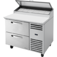 True’s pizza prep tables are designed with enduring quality that protects your long term investment. Factory engineered, self-contained, capillary tube system using environmentally friendly R290 hydro carbon refrigerant that has zero (0) ozone depletion potential (ODP), & 0.02 global warming potential (GWP). High capacity, factory balanced environmentally friendly forced-air refrigeration system holds 33°F to 41°F (.5°C to 5°C). Complies with and listed under ANSI/NSF-7. Stainless steel front, top, sides, and back. Heavy-duty 20 gauge front facing. Stainless steel, patented, foam insulated flat lid keeps pan temperatures colder, locks in freshness, and minimizes condensation. Interior – Stainless steel liner. Stainless steel floor with coved corners. Extra-deep 19–1/2″ (496 mm) full length removable cutting board included. Sanitary, high density, white polyethylene provides tough preparation surface. Each drawer accommodates two (2) full size 12″L x 20“W x 8″D (305 mm x 508 mm x 204 mm) pans (sold separately). Foamed-in-place using a high density, polyurethane insulation that has zero ozone depletion potential (ODP) and zero global warming potential (GWP).