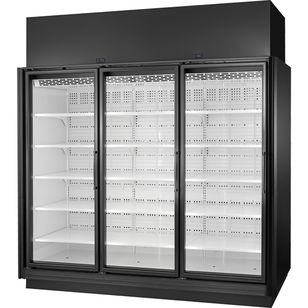 R290 natural refrigerant. Self-contained factory-charged and sealed refrigeration system. Interior finish: White. Exterior finish: Black. Temperatures of -10°F to 6°F -23.3°C to -14.4°C). Self-cleaning technology. NSF/ANSI standard 7 compliant for the storage and/or display of packaged products only. 4000k color temperature LED interior lighting. Total of 15 (5 per door) adjustable, solid white powder coated cantilever shelves 30”W x 25”D (762mmW x 635mmD). Energy Star® listed.