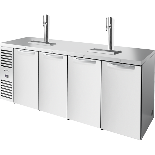 True’s direct draw beer dispensers are designed with enduring quality and value. Our commitment to using the highest quality materials and oversized refrigeration assures colder product temperatures and years of trouble free service. High capacity, factory balanced refrigeration system that maintains cabinet temperatures of 33°F to 38°F (.5°C to 3.3°C). Exterior – stainless steel doors, front and sides. Matching aluminum back. All stainless steel counter top. Interior – Stainless steel floor with 1/2″(13 mm) reinforced lip and heavy gauge galvanized steel walls. NSF/ANSI Standard 7 compliant for packaged or bottled product. One (1) 3″ (77 mm) diameter stainless steel insulated beer column. Cold air is directed into beer column to reduce foaming and maximize draft beer profits. Anodized aluminum glass rail provides convenient storage for glasses on top.