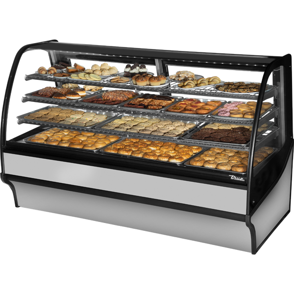 True’s "dry" display case combines efficient, high volume merchandising with an elegant curved glass front for sophisticated presentation of high end desserts and pastries. Cabinet is NSF/ANSI Standard 2 certified to hold open food product. Two (2) rear sliding glass doors for back access. Exterior – stainless steel rounded front and back, stainless steel side and front panels. Curved glass front and side glass panels. Stainless steel interior for those who appreciate the value of stainless. Three (3) tiered levels of adjustable wire cantilever shelves that match cabinet interior color. Chrome plated wire shelves standard on stainless units. Front glass swings Up for easy cleaning access.
