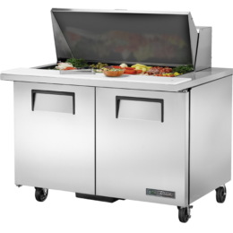 True’s salad/sandwich units are designed with enduring quality that protects your long term investment. Factory engineered, self-contained, capillary tube system using environmentally friendly R290 hydrocarbon refrigerant that has zero (0) ozone depletion potential (ODP), & 0.02 global warming potential (GWP). Patented forced-air design holds 33°F to 41°F (.5°C to 5°C) product temperature in food pans and cabinet interior. Complies with and listed under ANSI/NSF-7. Exterior – stainless steel front, top and ends. Corrosion resistant GalFan coated steel back. Stainless steel, patented, foam insulated lids keep pan temperatures colder, lock in freshness and minimize condensation. Removable for easy cleaning. Interior – attractive, clear coated aluminum liner. Stainless steel floor with coved corners. 11–3/4″ (299 mm) deep, 1/2″ (13 mm) thick, full length removable cutting board included. Sanitary, high density, white polyethylene provides tough preparation surface. Heavy duty PVC coated wire shelves. Foamed-in-place using a high density, polyurethane insulation that has zero ozone depletion potential (ODP) and zero global warming potential (GWP).