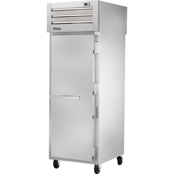 Equipped with low-velocity fans to assure even temperature distribution throughout the cabinet. Fans are controlled by exterior on/off switch. Two (2) stainless steel 1000 watt finned tube heating elements per section for uniform generation of electric heat. Cabinet comes with a total of 4000 watts. Three (3) lifetime guaranteed, cam-lift hinges. Full 180° open capability with a stay open feature at 120°. Designed to accept roll-in racks (inboard castors) with a maximum dimension of 27"L x 29"D x 66"H (686 mm x 737 mm x 1677 mm). One (1) heavy gauge stainless steel ramp standard (per door). Entire cabinet structure and solid door are foamed-in-place using Ecomate. A high density, polyurethane insulation that has zero ozone depletion potential (ODP) and zero global warming potential (GWP).
